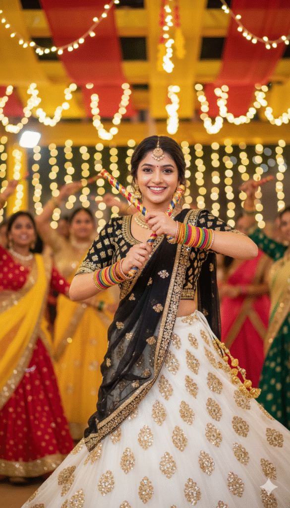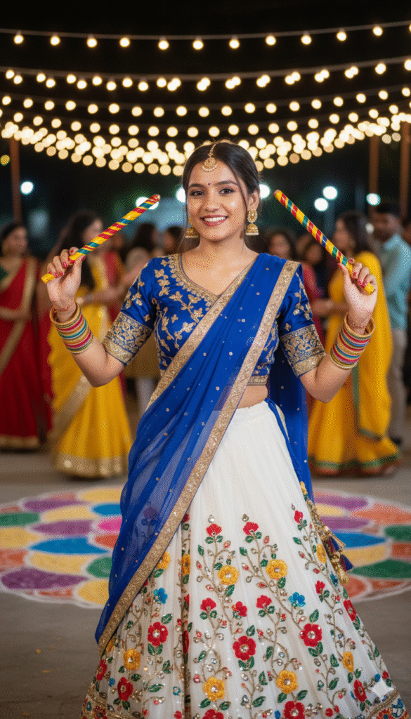 "Ultra-realistic 4K festive portrait of a young Indian woman celebrating Navratri. She is smiling and holding colorful dandiya sticks in both hands. She is wearing a royal blue blouse with matching dupatta and a white lehenga beautifully embroidered with multicolored patterns and golden designs. She is adorned with bangles and earrings, adding elegance to her traditional look. The background is decorated with bright hanging string lights. colorful rangoli on the ground, and people dressed in vibrant traditional outfits, creating a joyful Garba night atmosphere."