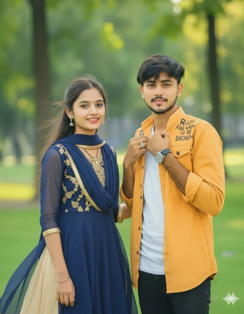 An Indian girl in traditional attire (salwar kameez or modest left side Indo-western dress) walks into frame and ently stands beside him, both smiling slightly as the wind soft, blows.