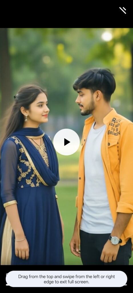 “Create a short cinematic romantic video from this couple photo. Keep the same original front angle of the photo (no change in perspective). First, show only the boy at the same angle, then smoothly reveal the girl coming closer next to him. She gives a soft smile while looking at him, and the boy gently smiles back. Do not show any kissing, hugging, or intimate actions — only natural smiling and subtle movements. Add light breeze moving her hair and soft warm romantic background lighting. Keep the scene emotional, simple, and cinematic with smooth zoom only.”
